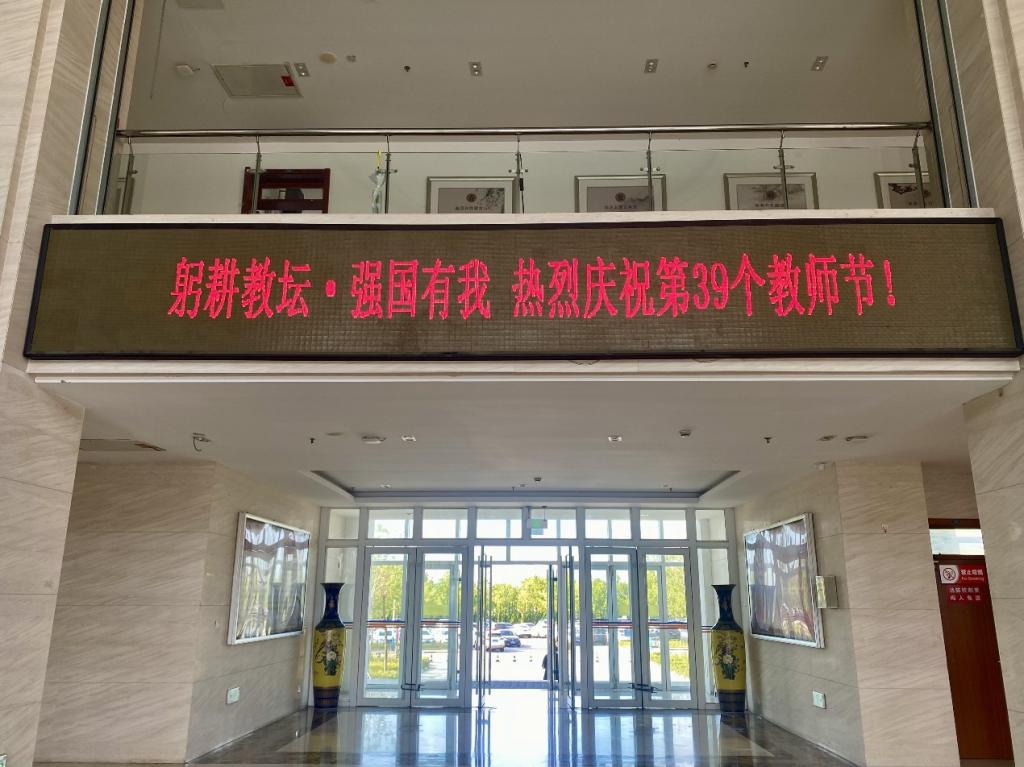 9月8日至9月10日,学校在综合办公楼、图书馆、学生公寓等多处建筑的电子显示屏上,通过字幕滚动的方式深情道出“热烈庆祝第39个教师节”“教师节快乐!”“躬耕教坛、强国有我”等祝福语。这些热忱的话语,既表达了对教师们的崇高敬意和真诚祝福,为教师“心”里点亮了一盏温暖的灯,也给整个校园营造出一片浓厚的节日氛围,引导学生感念师恩、礼敬老师。