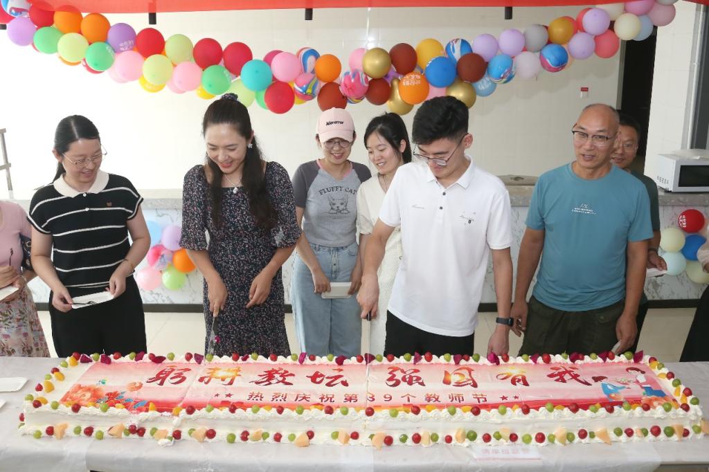 9月8日,学校在职工餐厅为老师们制作了一个巨型蛋糕,通过“一家人”同吃一个蛋糕的形式共同庆祝第39个教师节。长3米,宽0.6米的巨型蛋糕,在绿叶舒蔓、花蕊吐香的映衬中,“躬耕教坛强国有我”八个红色大字红色大字熠熠夺目,老师们聚在一起,共同切开蛋糕,品尝着这甜蜜的祝福,每个人的脸上都笑意盈盈,纷纷表示“这是过的最甜的一个教师节!”“感谢学校对我们的关心!”“这个教师节不仅‘甜’,更有‘爱’!”这份节日蛋糕也瞬间刷爆了老师们的朋友圈,让教师们充分感受到了学校的人文关怀。