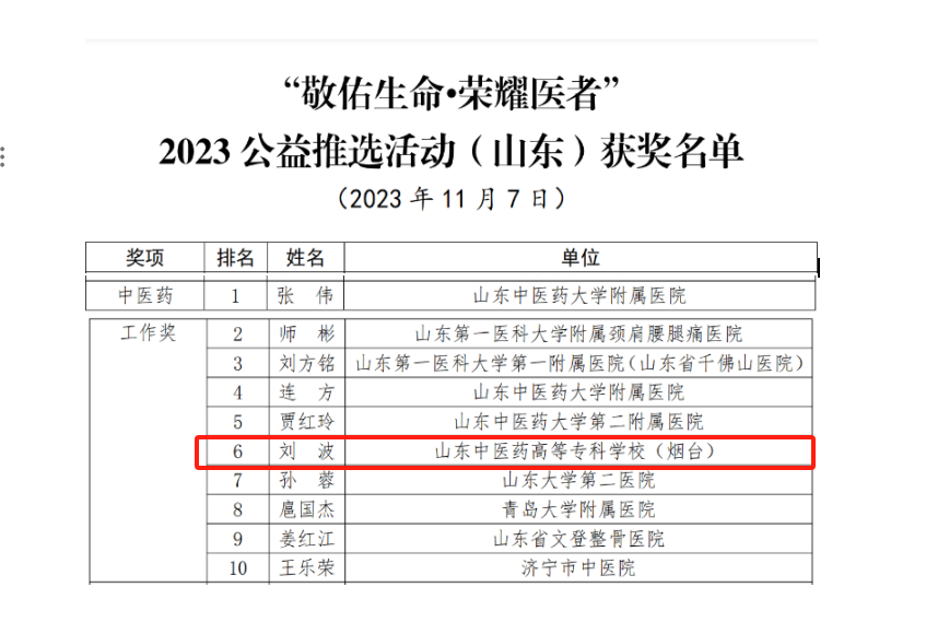 近日,“敬佑生命·荣耀医者”(山东)公布了获奖名单,刘波教授荣获“中医药工作奖”。